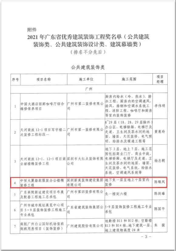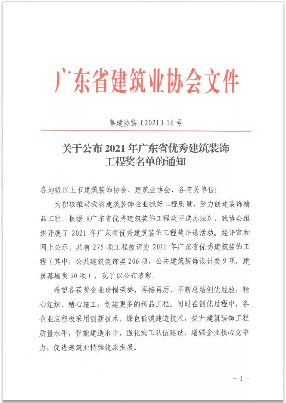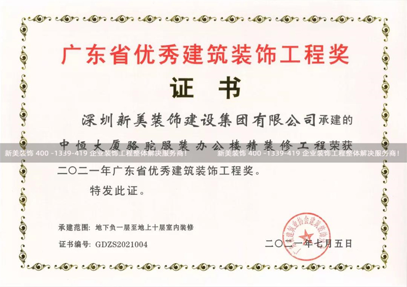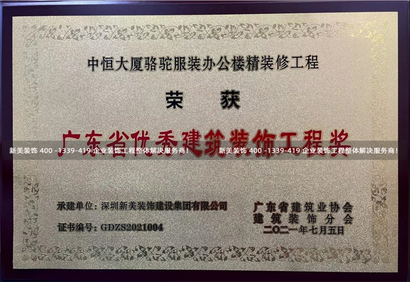 為積極推動我省建筑裝飾企業抓好工程質量,努力創建裝飾精品工程,根據《廣東省優秀建筑裝飾工程獎評選辦法》,經過嚴格選拔,重重評審,廣東省建筑業協會公布了“2021年廣東省優秀建筑裝飾工程獎”的評選結果。由深圳新美裝飾建設集團有限公司負責承建的“中恒大廈駱駝服裝辦公樓精裝修工程項目”榮獲“二〇二一年廣東省優秀建筑裝飾工程獎”,為集團品牌創優成果再添濃墨重彩的一筆。